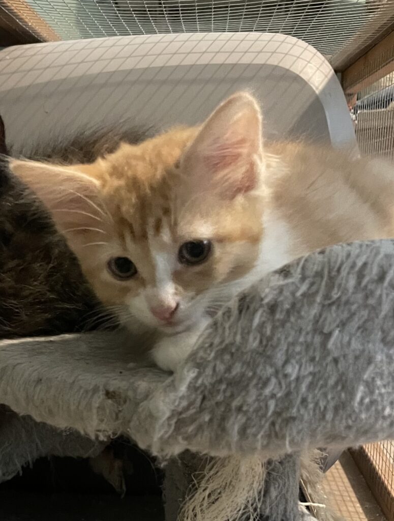 Cette jolie chatonne, rousse et blanche de 2 mois et demi à poils longs, est douce. Plutôt calme, elle aime les moments tranquilles, les siestes bien installée et les câlins discrets. Déjà habituée au contact humain, elle vient volontiers se faire caresser, tout en délicatesse. Elle s’entend très bien avec Anthea.